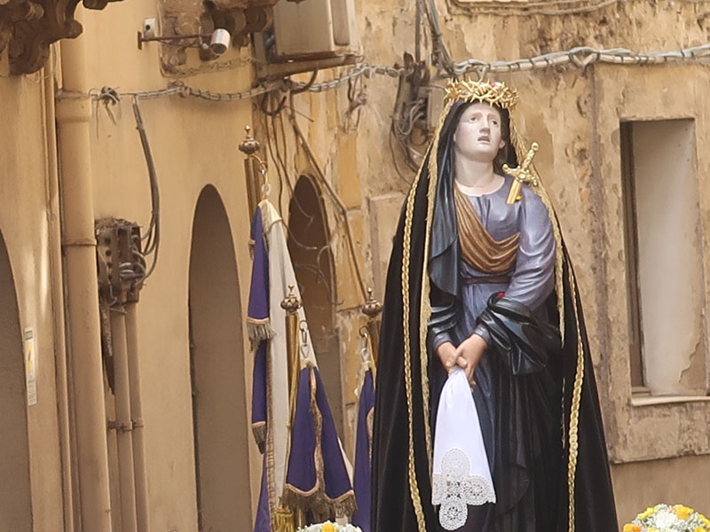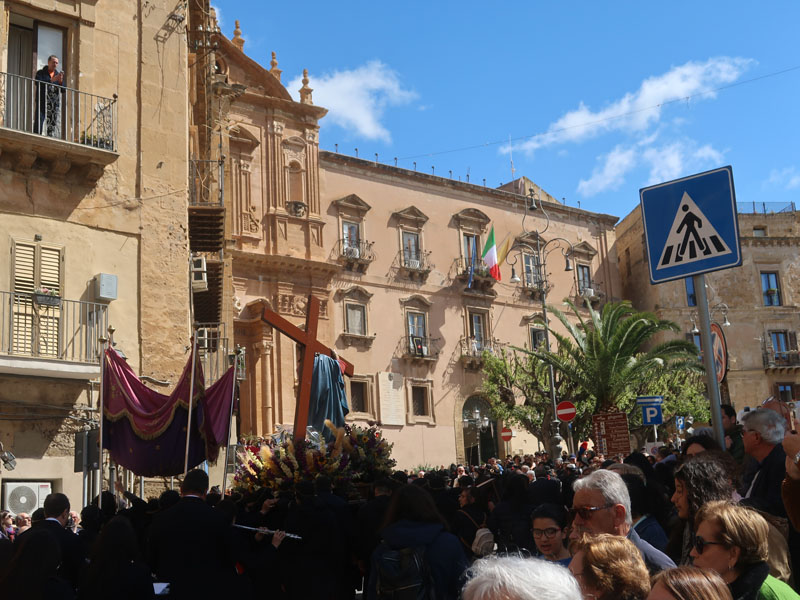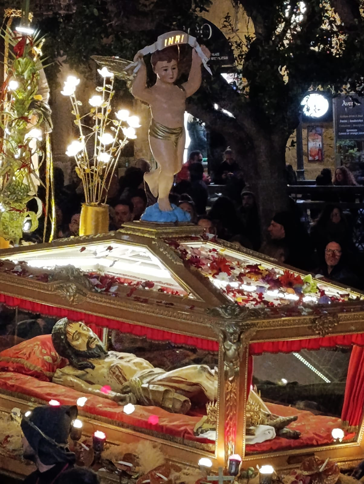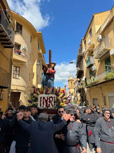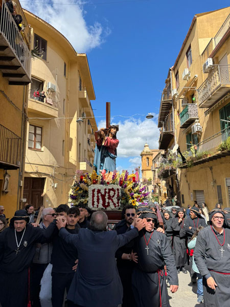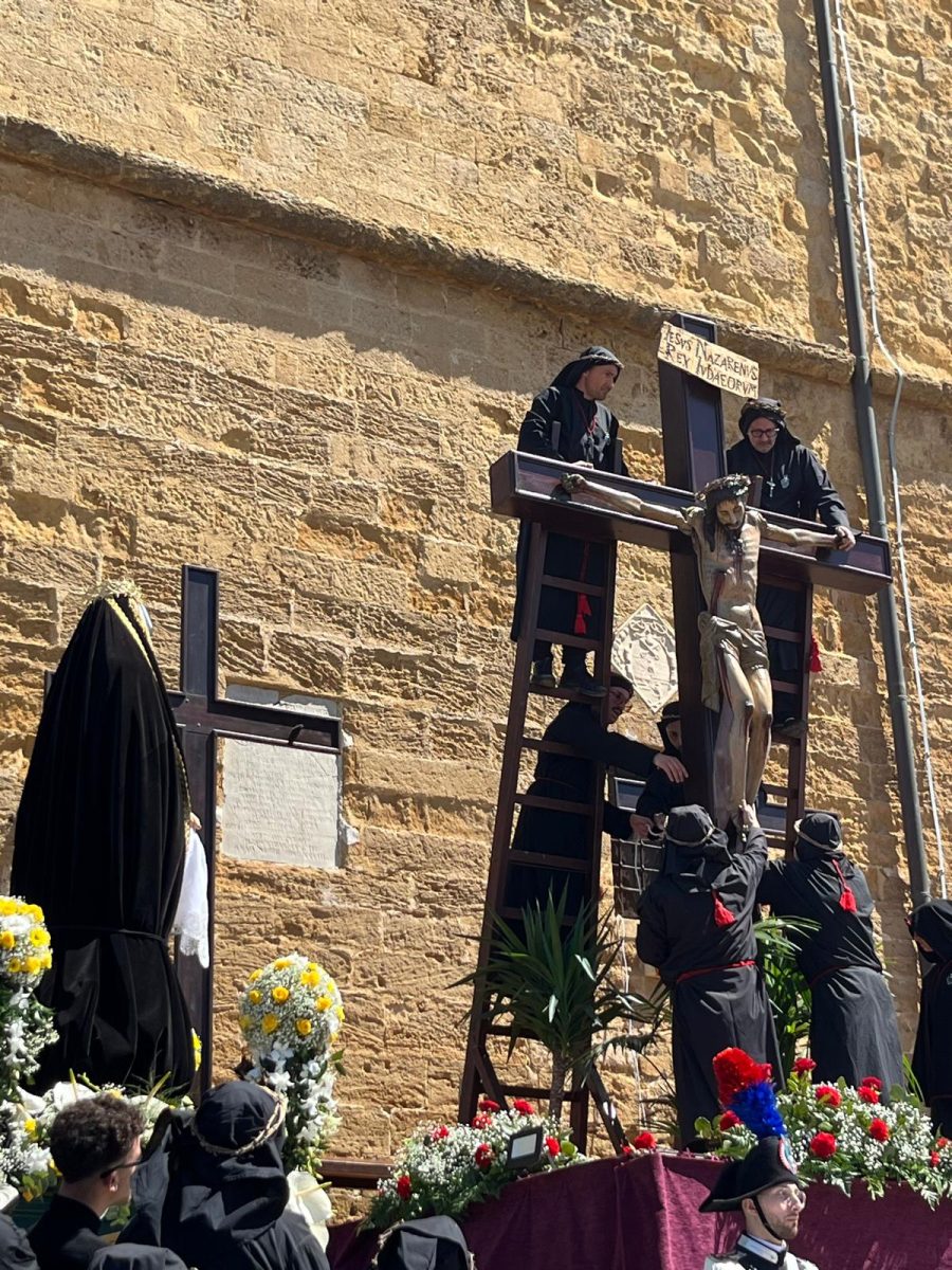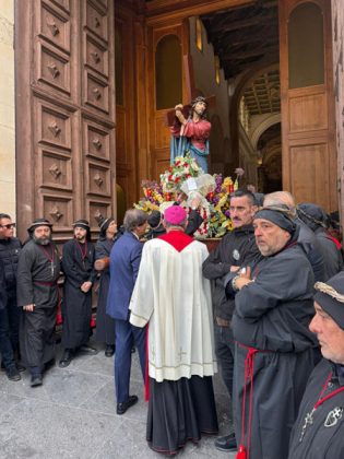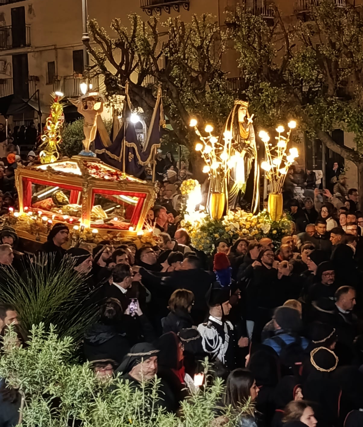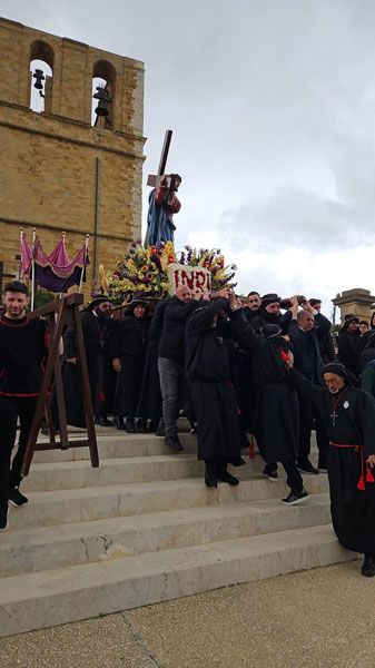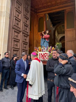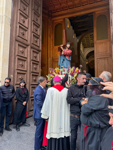 “ Ah, sì, versate lacrime. Sulle note di questa melodia tanto cara alla nostra tradizione – ha detto mons. Damiano al popolo fedele che gremiva la piazza – abbiamo cantato ancora una volta la nostra pena per il Cristo morto. Abbiamo invitato anche gli angeli a unirsi al nostro pianto, perché vorremmo che l’espressione della nostra commozione davanti al suo corpo esanime si dilatasse fino ad abbracciare non solo tutta la terra, ma anche il cielo.Eppure, Cristo – ha affermato – la morte l’ha già vinta. Lui è il Risorto e il Vivente.E se stasera con la carica emotiva di questa sacra rappresentazione – ci permette di rivivere il mistero della sua passione, è solo per ricordarci che la nostra compassione per lui è niente di fronte a quella che lui prova per noi. Anzi, offrendosi così – spogliato di tutto – alla nostra contemplazione, ci ricorda che è proprio questa compassione nei nostri confronti che l’ha spinto a diventare uno di noi, per venire a salvarci nell’abisso più profondo della nostra umanità, dove altrimenti non avremmo avuto alcuna alternativa alla morte.