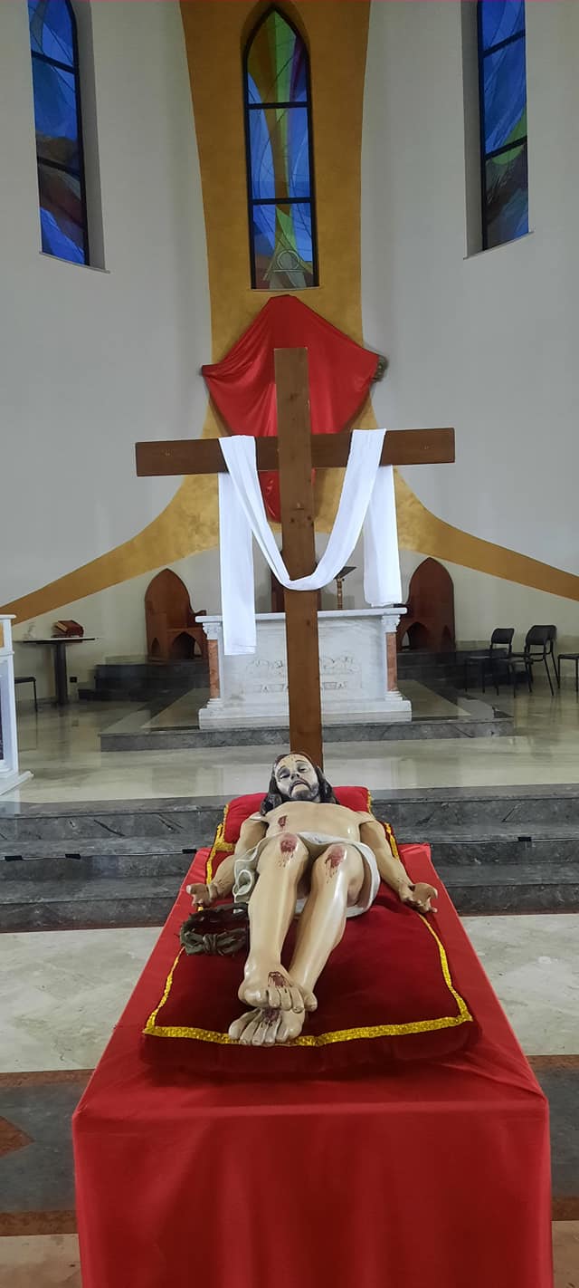 Dopo queste parole è stato proclamato il Vangelo della Passione a cui è seguito un prolungato momento di silenzio, la preghiera universale  ed il momento suggestivo dell’adorazione della Croce con il triplice invito volgere lo sguardo al  “legno della Croce, al quale fu appeso il Cristo, Salvatore del mondo”, mentre la Croce, posta al centro dell’Assemblea,  veniva svelata dal drappo rosso che la copriva e l’Assemblea cantava “Venite adoriamo”. Prima della comunione eucaristica si è tenuta la colletta per la Terra Santa in segno di comunione e di solidarietà per ricordarci e  non ignorare le situazioni di bisogno e di difficoltà dei nostri fratelli e delle nostre sorelle che vivono nei Luoghi Santi. La Celebrazione, dopo la benedizione, si è sciolta in silenzio in attesa della Veglia solenne durante la quale si celebra la Risurrezione di Gesù.