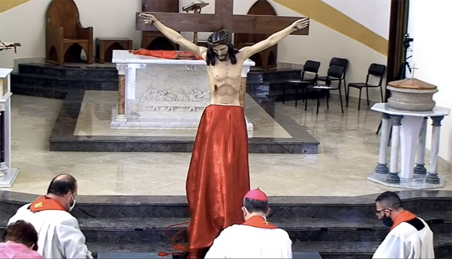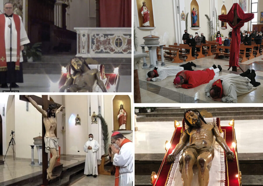 Ad Agrigento – a causa della pandemia, come lo scorso anno , tutte le manifestazioni pubbliche della pietà popolare sono state sospese. L’Arcivescovo, Francesco Montenegro, alle ore 16:00,  ha presieduto l’Azione liturgica della Passione del Signore a cui  sono seguiti momenti di preghiera personale e comunitaria, dei fedeli e dell’Arciconfraternita del Crocifisso,  fino alle 20:00 quando è stato deposto alla venerazione il “Cristo morto” (Vedi) e il cardinale Francesco Montenegro – dopo il tradizionale canto dell’ “Ah si versate lacrime”(vedi) ha pronunciato il messaggio all’Arcidiocesi e alla Città, che tradizionalmente si tiene durante la processione del Venerdì Santo,  con l’Urna del “Cristo morto” e la Statua dell’Addolorata. In piazza San Domenico, sul sagrato della Concattedrale. (Ascolta e vedi qui)