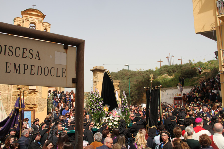 Pubblichiamo il testo della riflessione che l’arcivescovo di Agrigento, mons. Alessandro Damiano, ha pronunciato sul sagrato della Chiesa San Domenico durante la processione notturna del Venerdì Santo quasi al termine del lungo giorno penitenziale, «segnato – ha detto l’Arcivescovo – da dolori lontani e turbamenti attuali, con la processione di Gesù “appassionato” per le vie e tra le case di un quartiere cuore della “cittadella” di Agrigento. Sulla via abbiamo vissuto “l’incontro” della Madre addolorata con il Figlio caricato dalla croce.