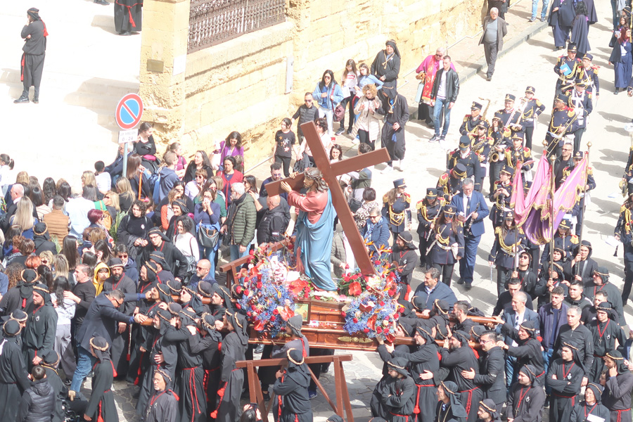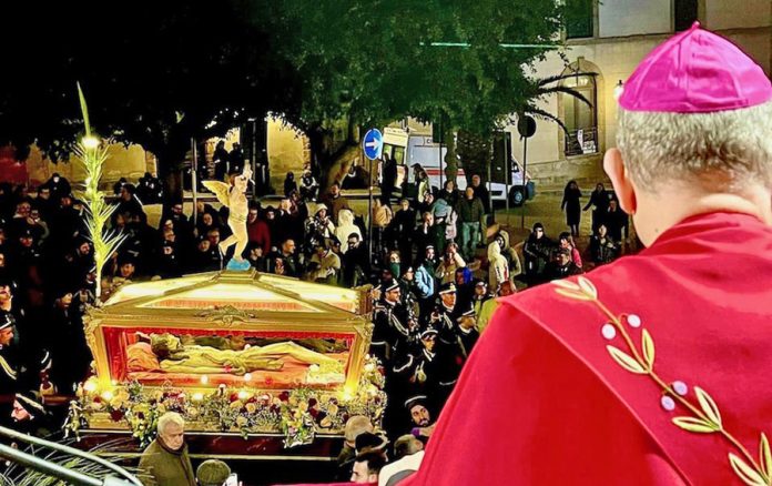 Tappe dell’intensa giornata che mons. Damiano ha voluto percorrere accanto e con il popolo fedele e le confraternite del SS. Crocifisso e dell’Addolorata perché come ebbe a dire in occasione della inaugurazione della mostra fotografica “I Misteri di Pasqua, nella Chiesa San Lorenzo, “la processione del Venerdì Santo, va vissuta per immersione, bisogna immergersi nella processione; raccontarla è sempre un impoverimento”. Sul sagrato della Chiesa San Domenico davanto all’urna del Cristo morto, secondo il metodo di preghiera ignaziano della “composizione del luogo” ha invitato i presenti a immaginare la scena del processo a Gesù davanti a Pilato; a sostare dinanzi a Pilato che ci mostra Gesù: