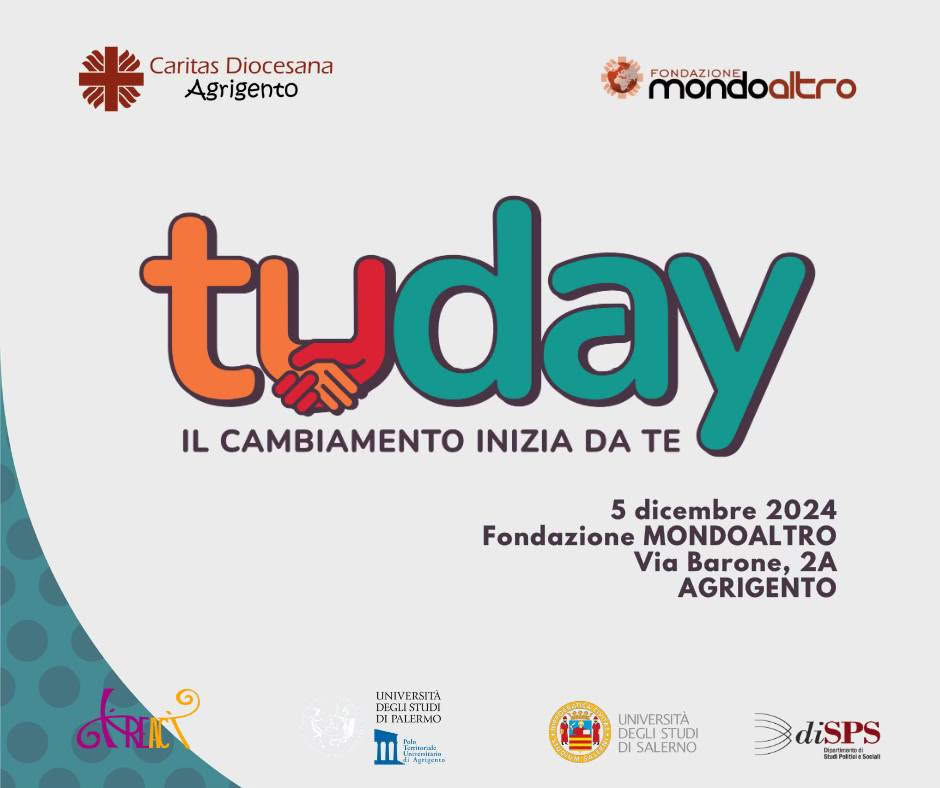 L’evento “TUDAY. Il cambiamento inizia da te” ha ricevuto il patrocinio del Polo Territoriale Universitario di Agrigento e dell’Università degli Studi di Salerno (Dipartimento Studi Politici e Sociali) e ha come obiettivo quello di partire dalla percezione dei giovani sul volontariato e sulla partecipazione giovanile per sfatare stereotipi e immaginare future traiettorie educative per il territorio locale.